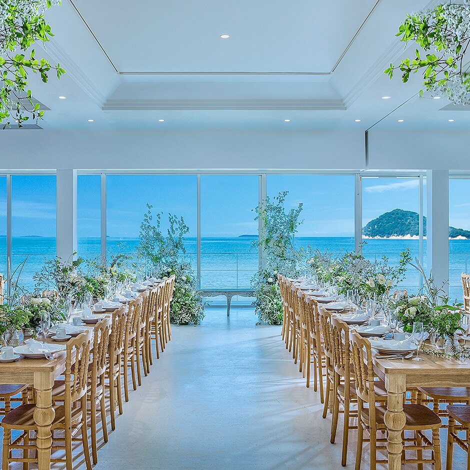 父母ヶ浜のブルーと生花のグリーンが爽やかで上品な空間をご提案