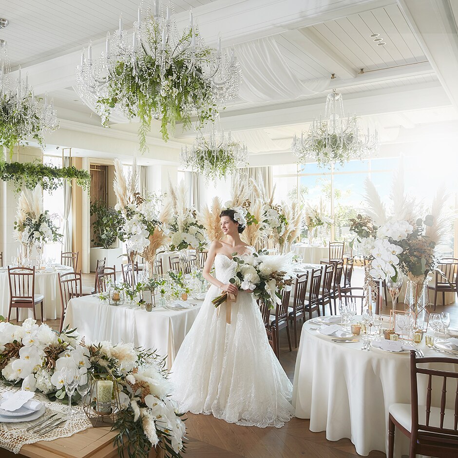 大人花嫁への上質空間【フィオーレカーサ】。ホワイトを基調とした会場はゆっくりとゲストと寛げる落ち着いた雰囲気