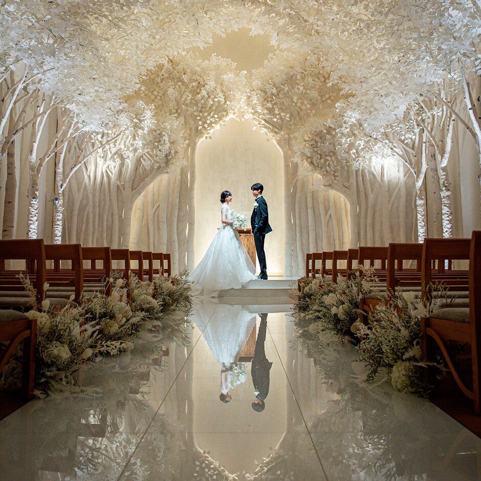 モチーフである白樺が意味する木言葉は「家族」「母」。木漏れ日がバージンロードに差し込む光の演出は印象的で、誓いのシーンに感動をもたらす。天井高は7m!大勢のゲストに見守ってもらえる壮大なスケールも魅力