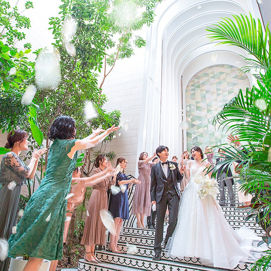 大階段をおりた先のプライベートなガーデンテラスは絶好の演出スポット。天候を気にすることなく屋外演出を楽しめて、写真もたくさん残せる。ひと続きのパーティ会場は華やかさと気品に満ち、主役感満載の入場も実現