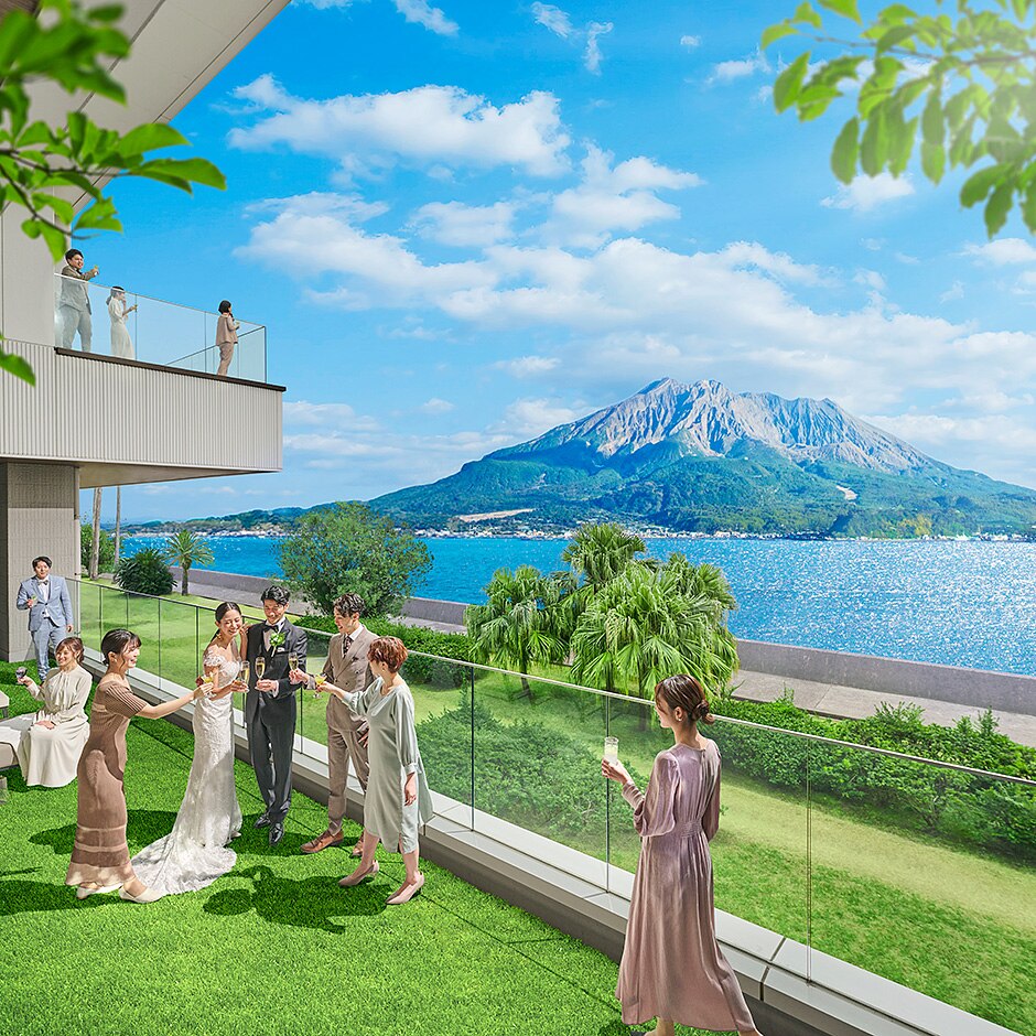 絶好のロケーションを独占できる開放感抜群のテラス。季節や時間帯で表情を変える桜島の雄姿がふたりの特別な一日の背景に。肩ひじ張らずにリラックスして過ごす時間がみんなの笑顔を引き出す何よりの魔法