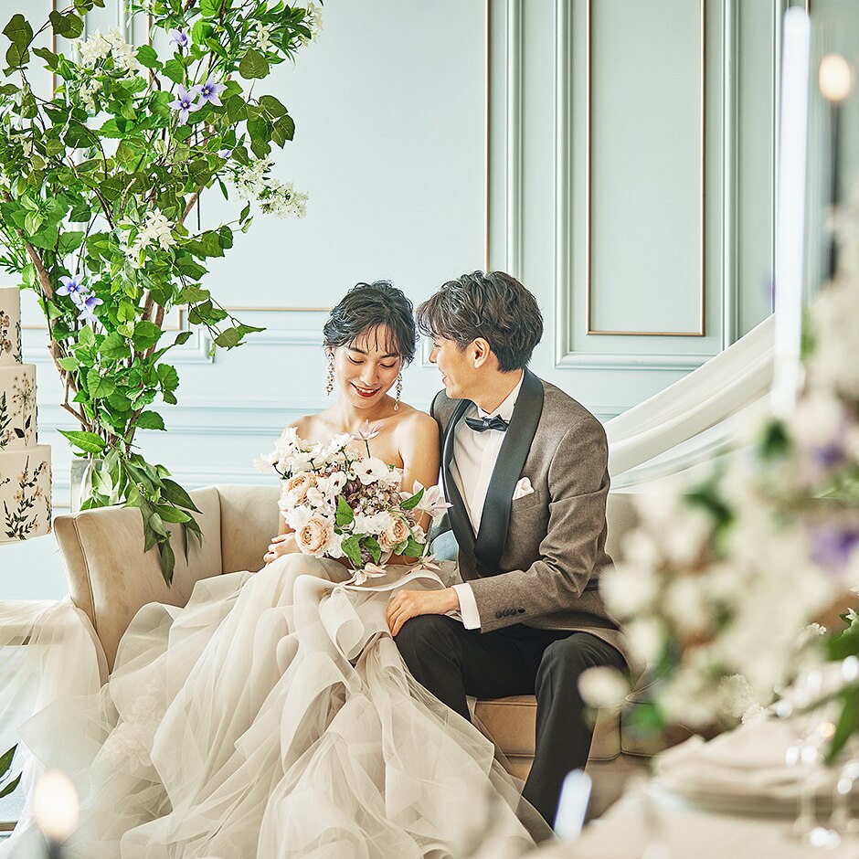 シャンデリアから優しい光が降りそそぐ会場。ふたりの好みに合わせて、トレンドを取り入れたコーディネートも提案してくれるので期待して。洗練された雰囲気でありながら自然と心が綻ぶ、そんな温かな時間が流れる。