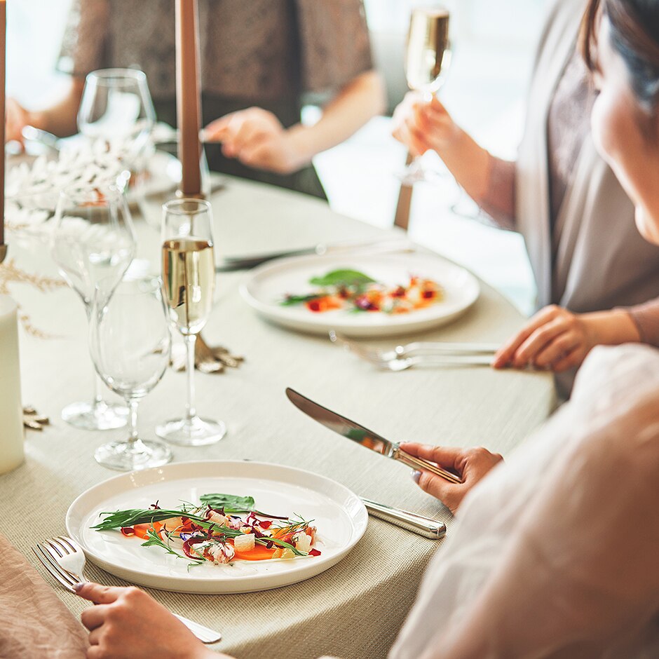 色鮮やかなフレンチ、中華の味わいにフレンチの感性を取り入れた料理、繊細で趣のある和。料理は多彩なコースの中から選べる。こだわり食材を使った逸品は美味しいだけではなく、見た目も美しく、特別感を演出する。