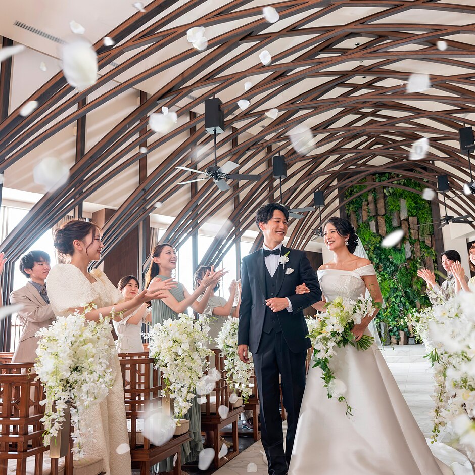 優美なラインを描くアイアンアーチと、高さ約6mものグリーンウォールが印象的なチャペル。広めに造られた大理石のバージンロードには、ウエディングドレスのトレーンが美しく広がり、ゲストを魅了する