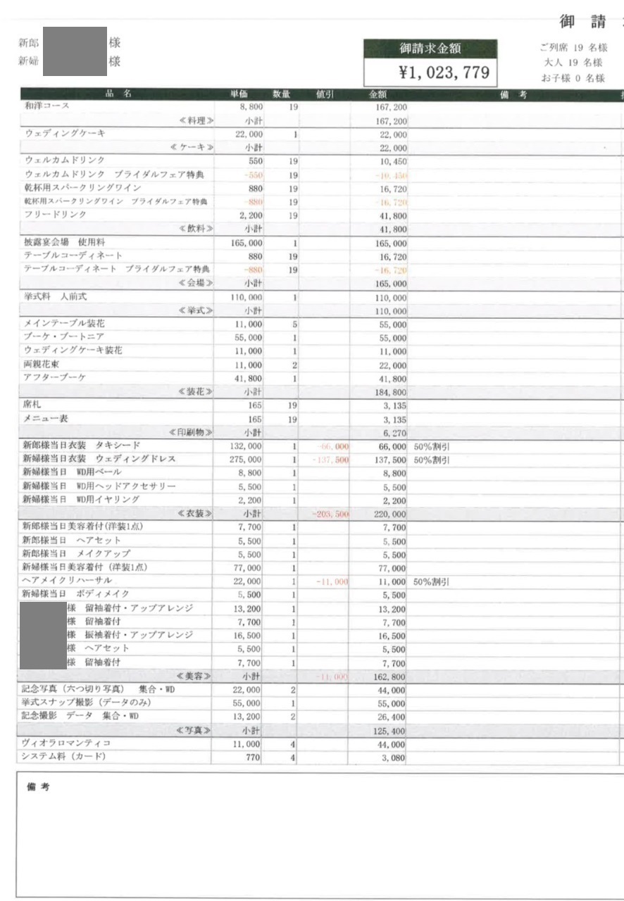 ※料金実例では申込金などを含む会場に支払った"総額"を表示しています。また、料金明細画像の項目名をもとに独自の基準で分類しています。
