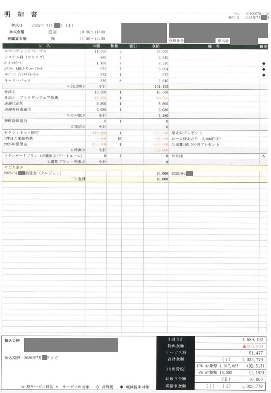 ※投稿された金額情報は、日取り、申込みのタイミングや会場の空き状況等によって異なるため、最終費用明細の項目や金額をもとにした、式場との価格交渉や追加サービス等の要望はご遠慮ください。