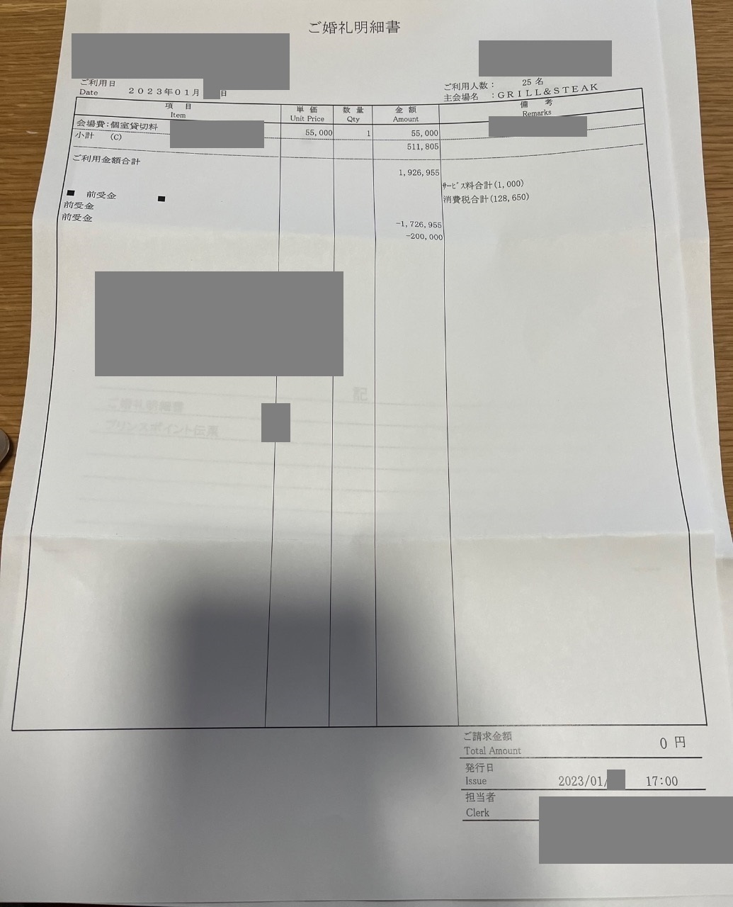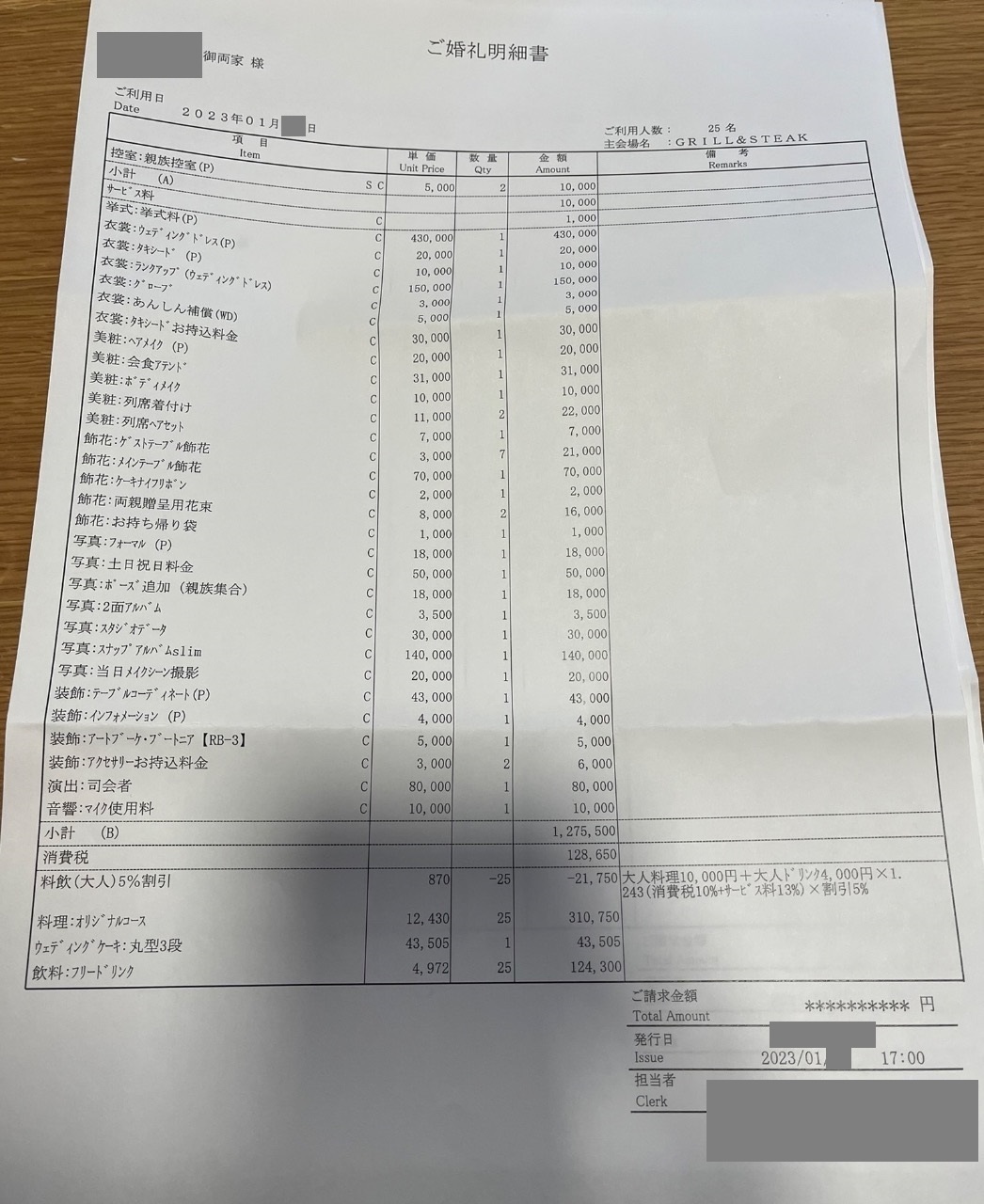 親族は前日ホテルに泊まりましたが、式場経由より自分でネットで早めに予約した方が安かったので、明細書には入っていません。