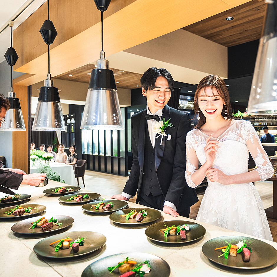 当日のコース料理はお二人のご希望に寄り添った内容で仕上げます。オープンキッチンから音や香りもお届け!