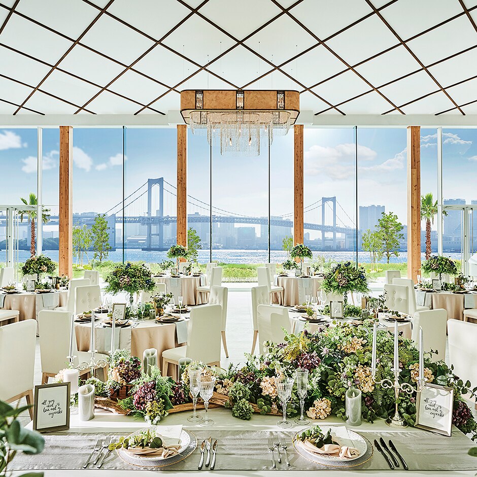 レインボーブリッジやお台場エリアなどの絶景で非日常的な一日を。解放感ある天井高と大窓から自然光そそぐ明るい会場!