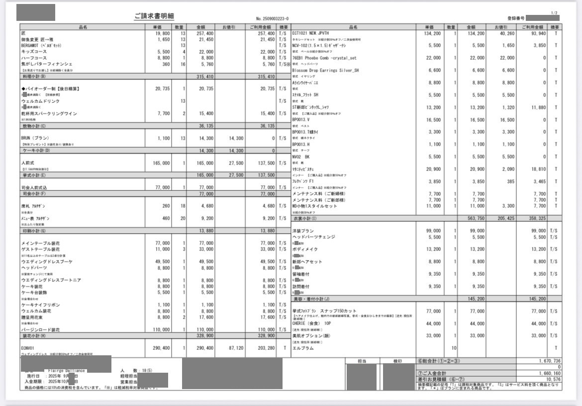 初期見積もりよりは上がりましたが、装花や衣装代が追加されることは聞いていましたし、写真の枚数や親族の着付けなど追加もあり、だいたい想定内の最終見積もりになりました。オルガニストに知り合いがいたので割引してもらえました。