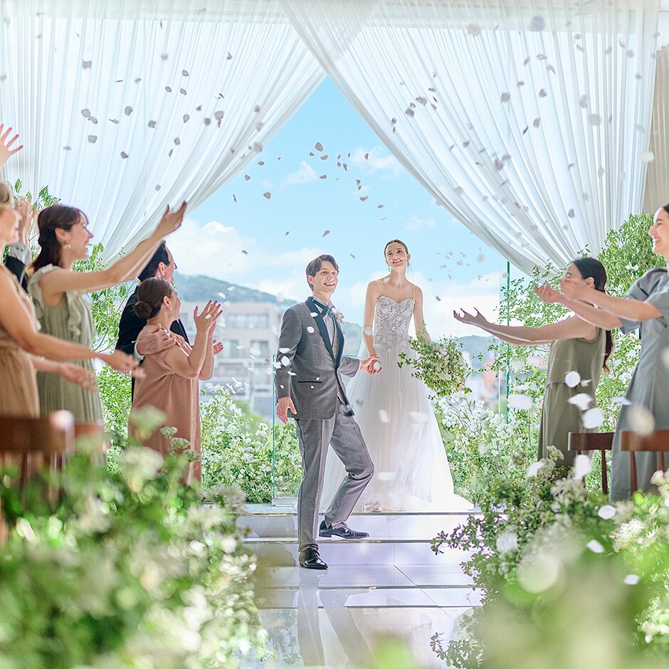 ゲストとの距離も近く、大切なゲストからの祝福が間近に感じられる。新しい家族の絆を結ぶセレモニーのフィナーレは、フラワーシャワーの祝福を受けよう!