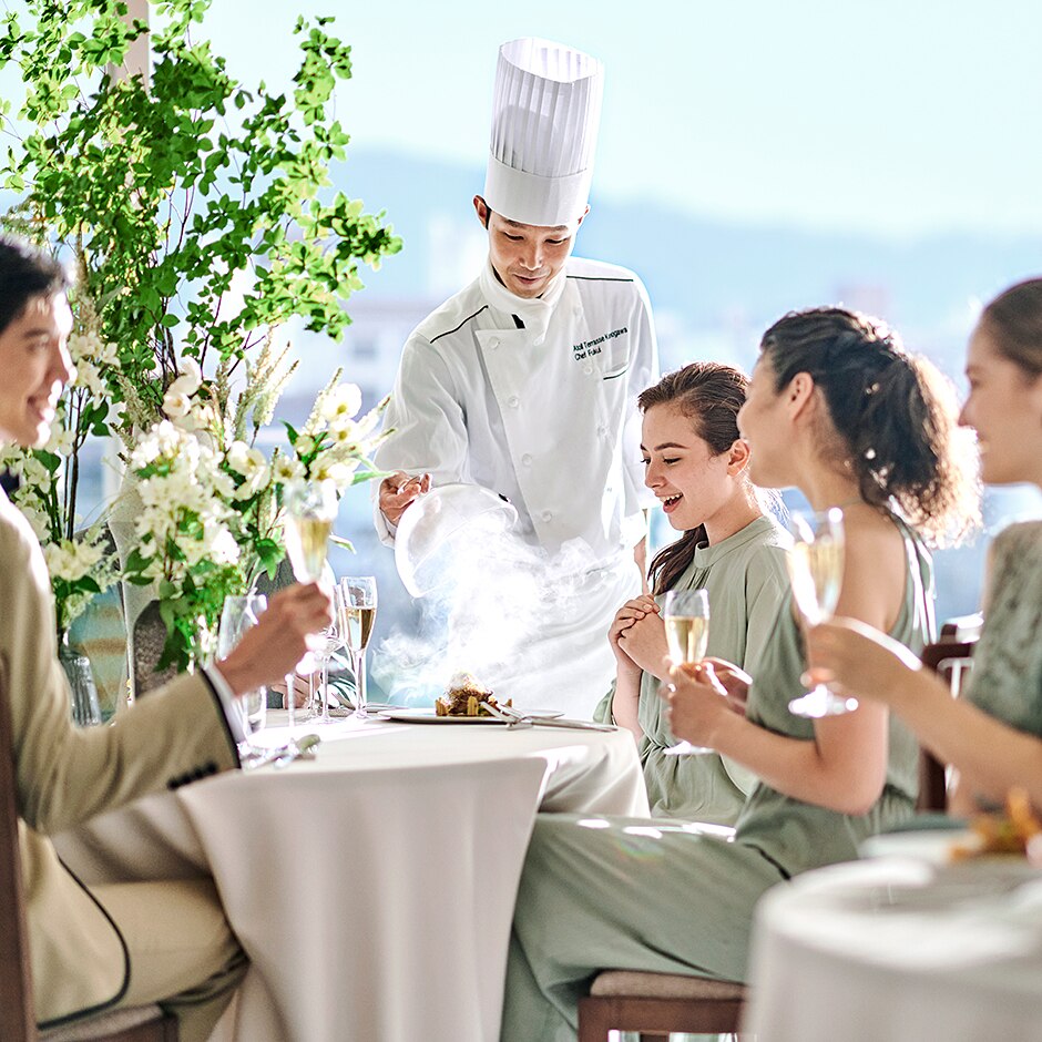 ご安心ください。アトールテラス鴨川では全てのコース料理にお箸をお付けしております。また、食べやすいよう一口サイズへのカット対応や、和食のワンプレートなども対応していますので、お気軽にご相談ください。またこの度「和」専門のコースも登場し、ゲストの皆様全員への和料理の提供も可能です。