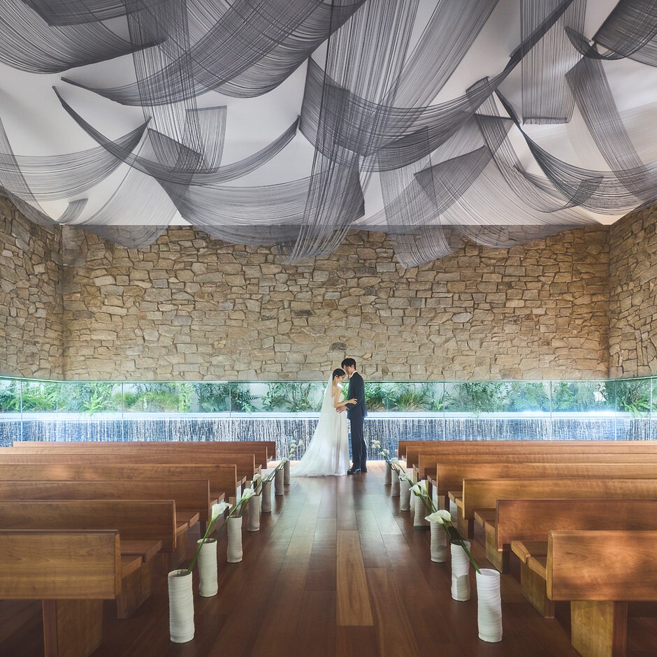 滝に囲まれた独立型のチャペルは まるで水の中にいるような神秘的な空間 -