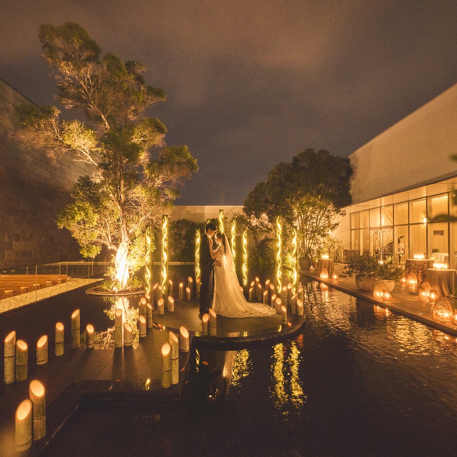 水面にゆらめくキャンドルの灯りで より一層 幻想的なナイトウェディングに