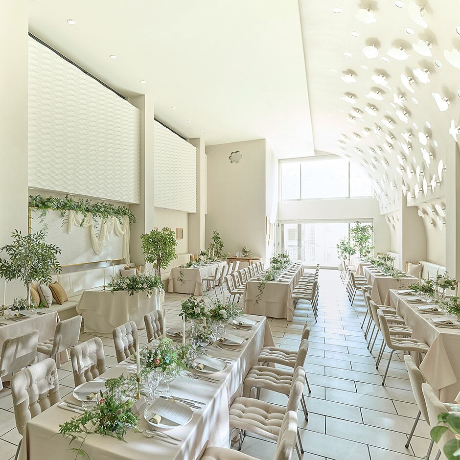 優しい緑と自然光に包まれるクラシカルな佇まいのピュアホワイトのホールは、上質感あふれる挙式会場。お得なスペシャル特典も登場。挙式料無料、会場料最大半額、2着目衣裳3割引など内容充実。