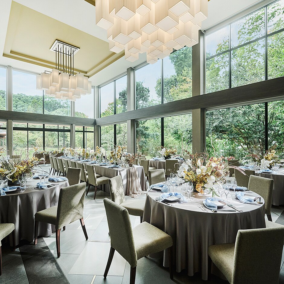 高宮庭園茶寮の自然豊かなみ緑が目の前に広がり癒される空間。季節の移ろいも感じる風情溢れるチャペル