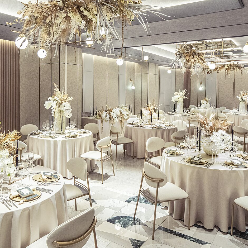 訪れる人の感性を刺激する、気品溢れるパーティ会場。ゴールドをアクセントとしたシンプルで上品な空間だからこそ、多彩なアレンジが叶う。婚礼料理は四季の移ろいを一皿一皿で表現した同館オリジナルコースを用意