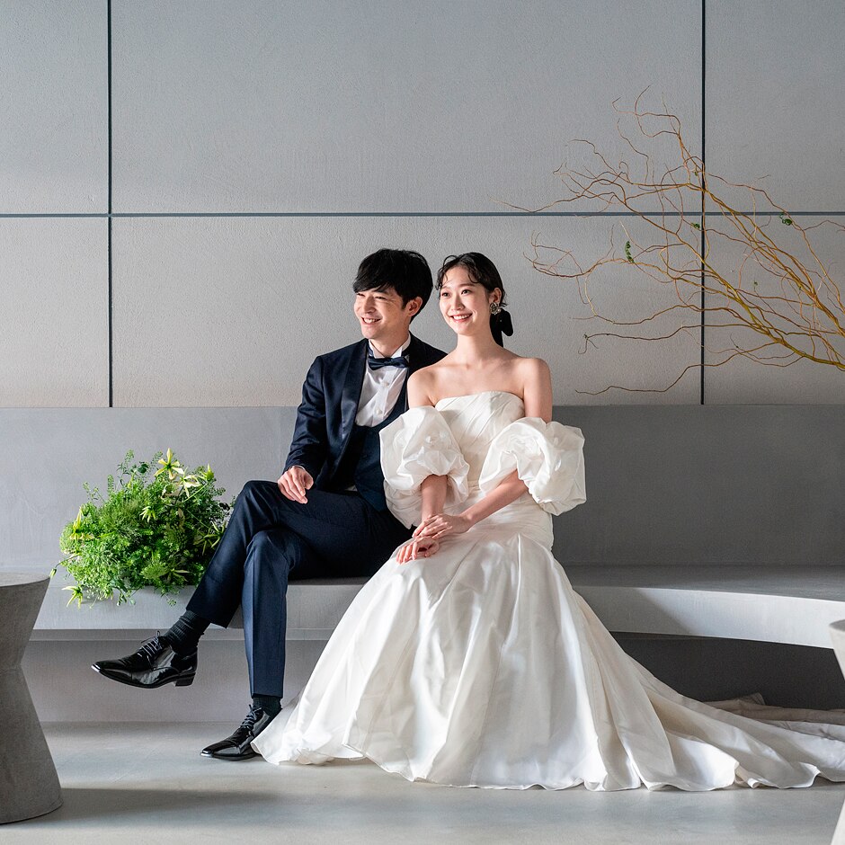 柔らかなドレープと計算されたシルエットが、上品でモダンな花嫁を演出