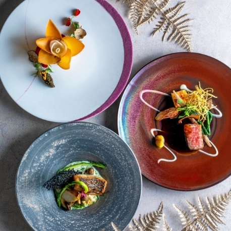 【”五感で愉しむ”試食】三ツ星シェフ厳選”国産牛・オマール・トリュフ”などを使用したフルコースをご堪能。メイン料理のエッセンスが選べるセレクトソルトなど当館こだわり演出でゲストとおふたりをおもてなし。