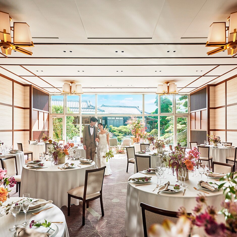 四季折々の風景が祝宴に華やぎと寛ぎを添える開放的な空間。デザート&寿司ビュッフェなど様々な演出や歴史薫るラウンジでふたりらしさ溢れるおもてなしが叶う。非日常の贅沢な空間でゲストと想い出に残るひと時を。