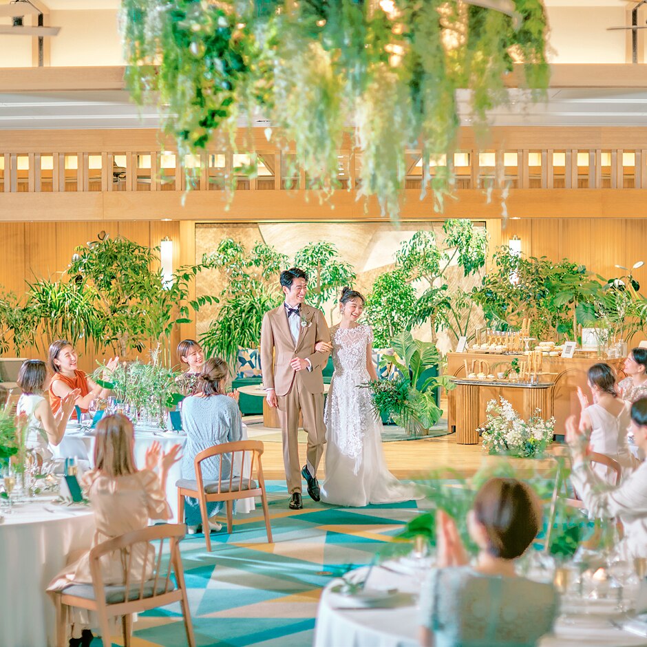 挙式会場の天井が高く、窓が広く開放的で、天候に左右されずに挙式できるところ、緑が多いナチュラルな雰囲気に魅力を感じ、こちらで式を挙げることに決めました。また、披露宴会場も広く開放的で、オープンキッチンが付いており、温かく美味しい食事をその場で楽しめるところがいいなと思いました。アットホームかつ温かな空間で、設置されたソファにて参列者の方々とお話できるなど、参列者の方々との時間をたくさん楽しむことができるところが素敵でした。また、駅からのアクセスもよく、ホテルのため当日のお支度なども気軽な気持ちでできるところも魅力のひとつです。プランナーさんもとても親切で優しく、試食させていただいたご飯が非常に美味しく、みんなとこの素晴らしい空間と美味しいご飯を共有したい!と思いました◎