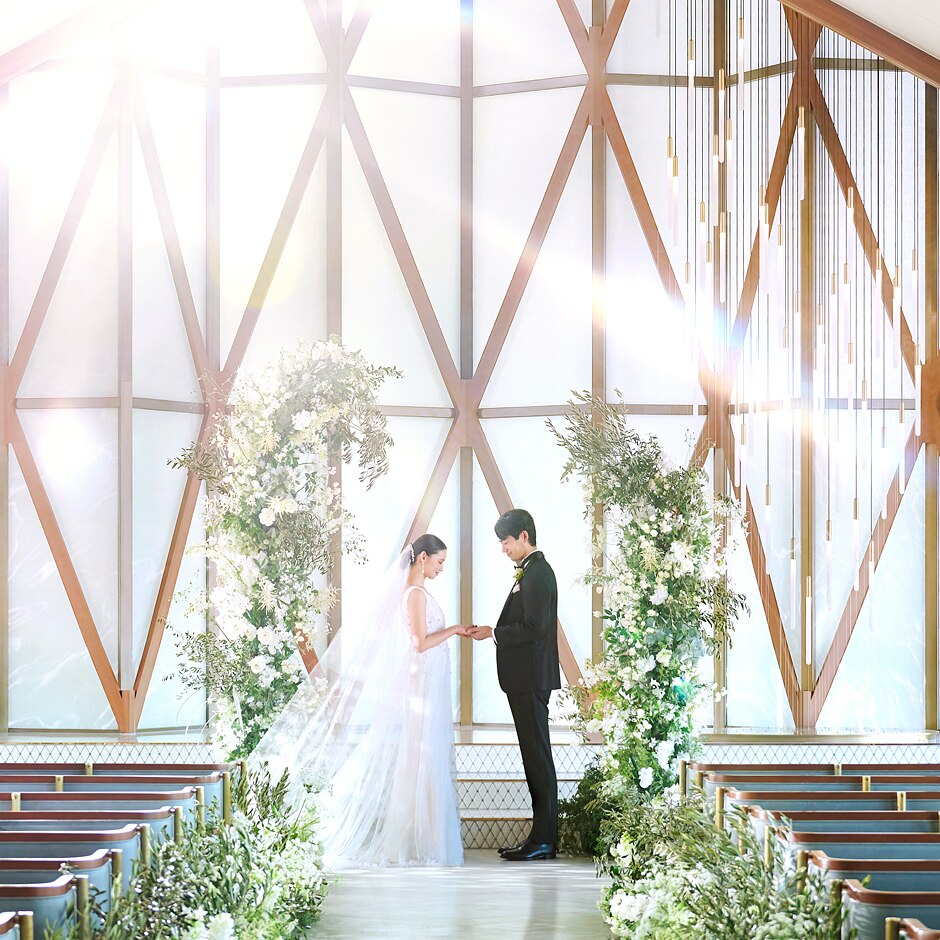 ホテル最上階の15階に位置し、8mの天井高と15mのバージンロードが壮大なスケールのチャペル。自然光が差し込む大きな窓からは、街を一望できる美しい景色が広がり圧巻。ゲストの印象に強く残る誓いのシーンを