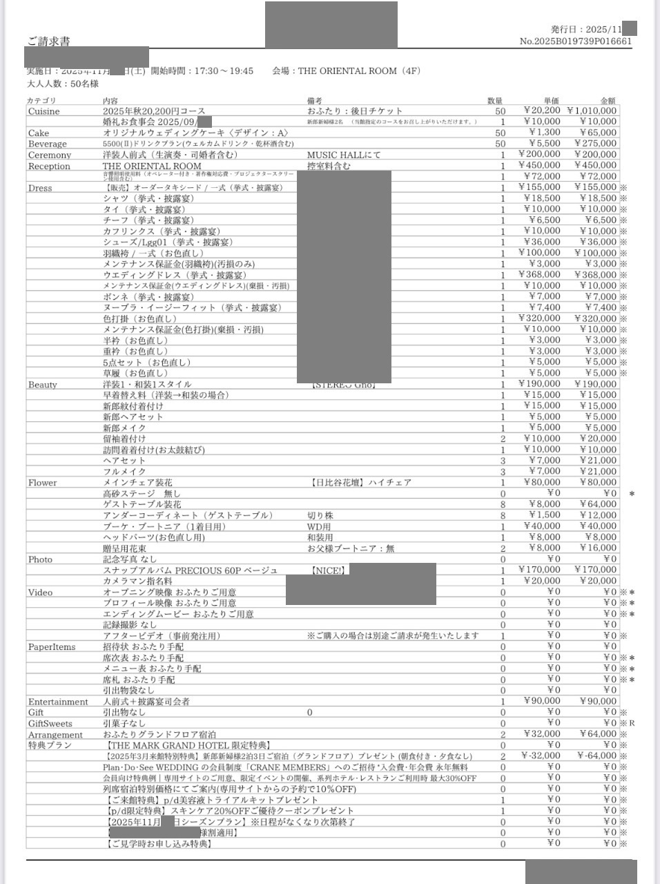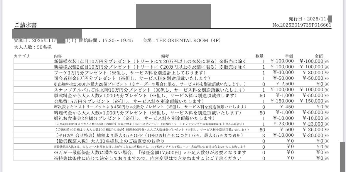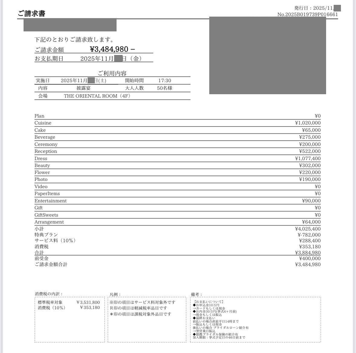 ※投稿された金額情報は、日取り、申込みのタイミングや会場の空き状況等によって異なるため、最終費用明細の項目や金額をもとにした、式場との価格交渉や追加サービス等の要望はご遠慮ください。