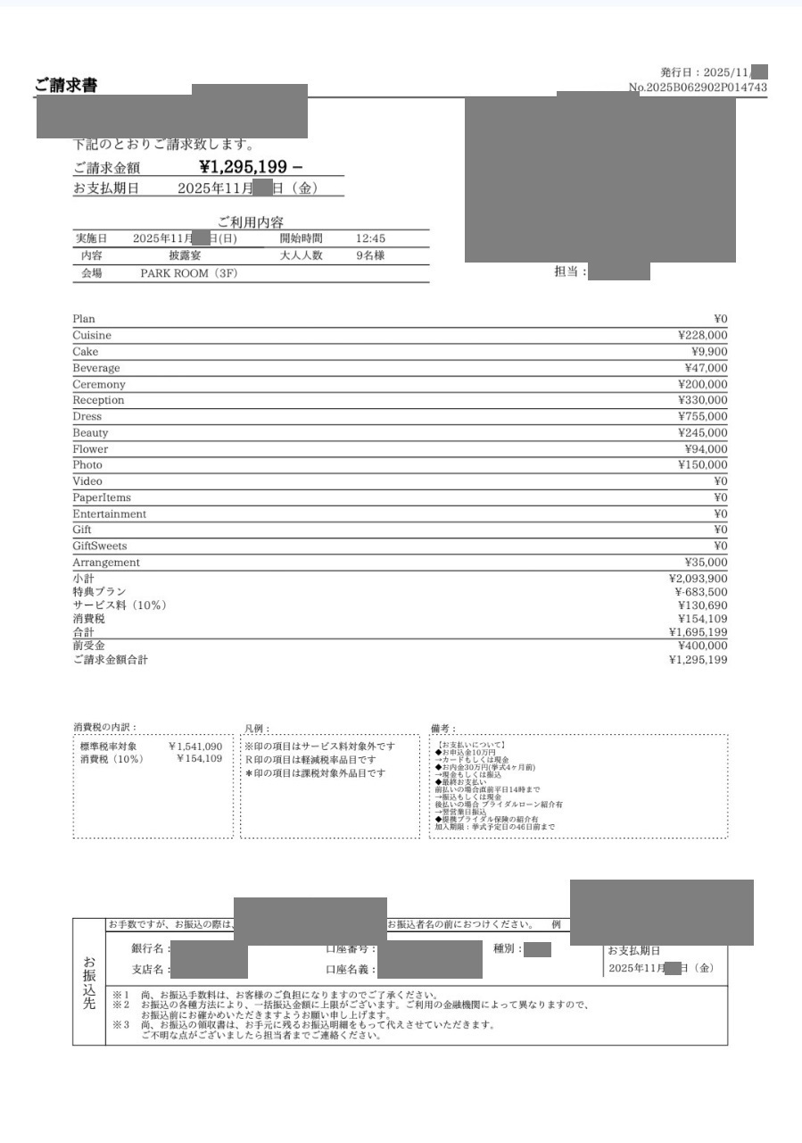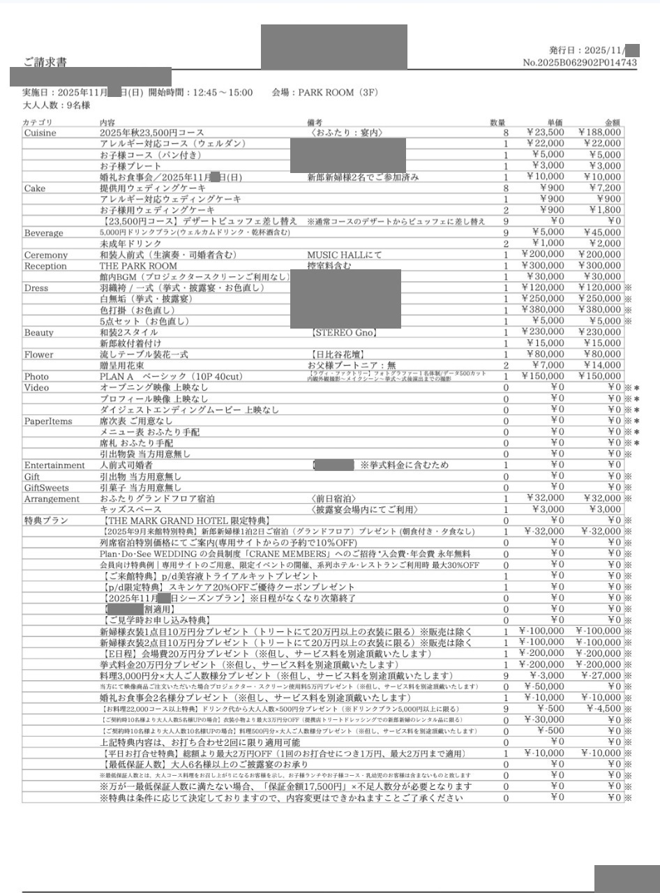 ※投稿された金額情報は、日取り、申込みのタイミングや会場の空き状況等によって異なるため、最終費用明細の項目や金額をもとにした、式場との価格交渉や追加サービス等の要望はご遠慮ください。
