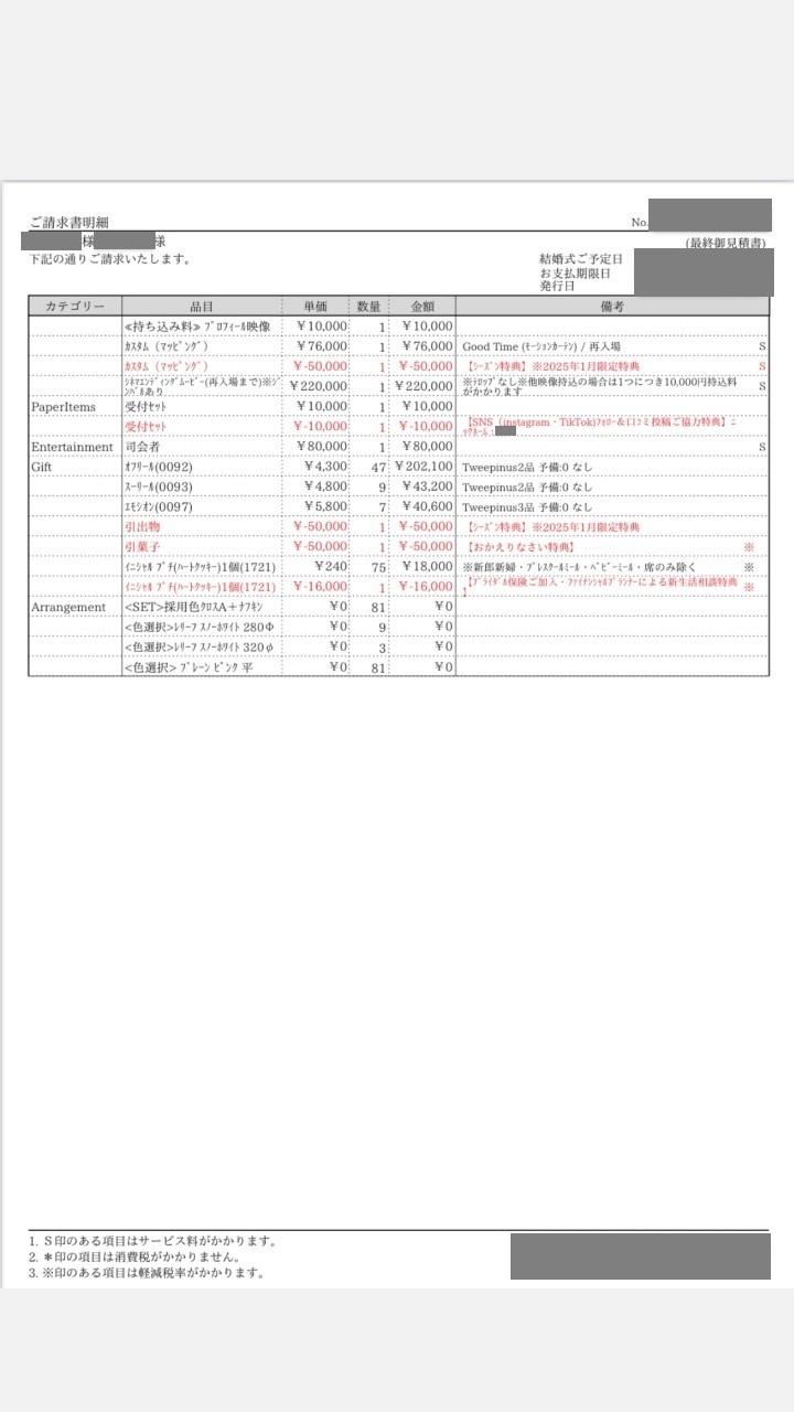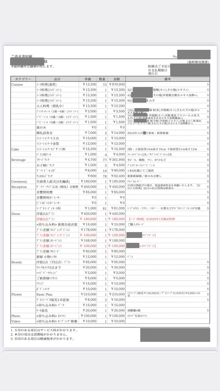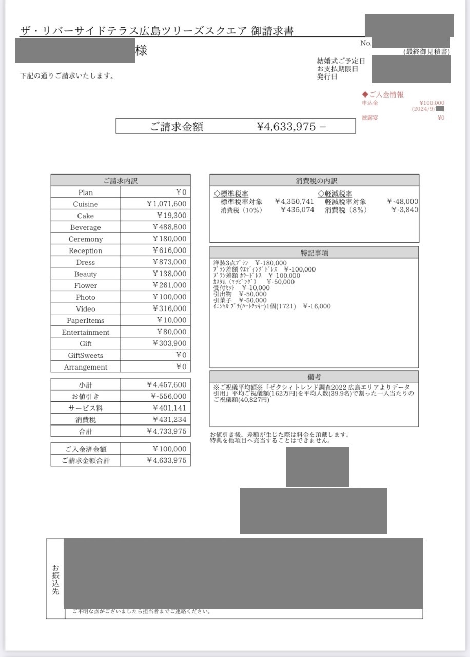 ※投稿された金額情報は、日取り、申込みのタイミングや会場の空き状況等によって異なるため、最終費用明細の項目や金額をもとにした、式場との価格交渉や追加サービス等の要望はご遠慮ください。