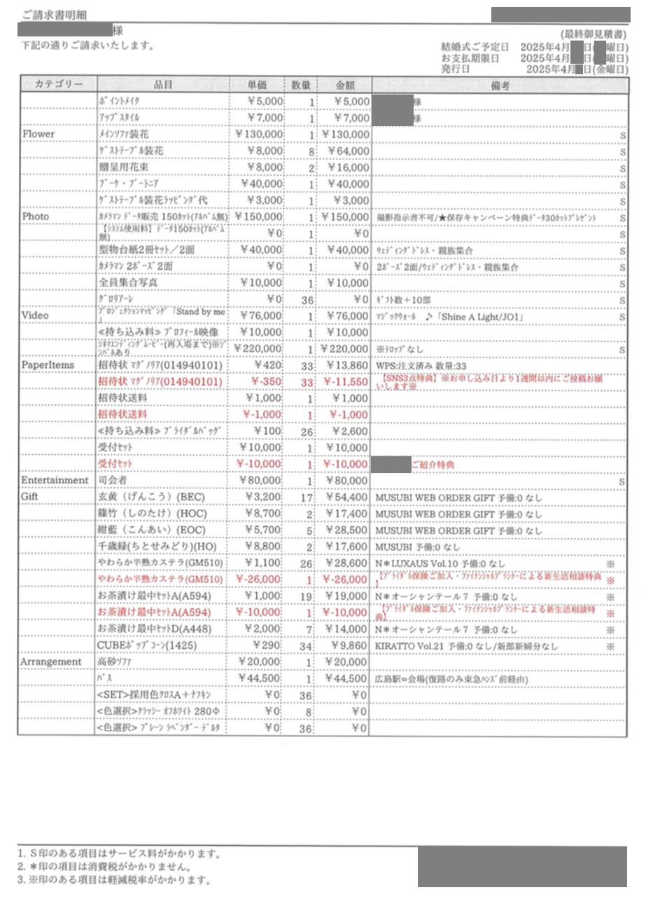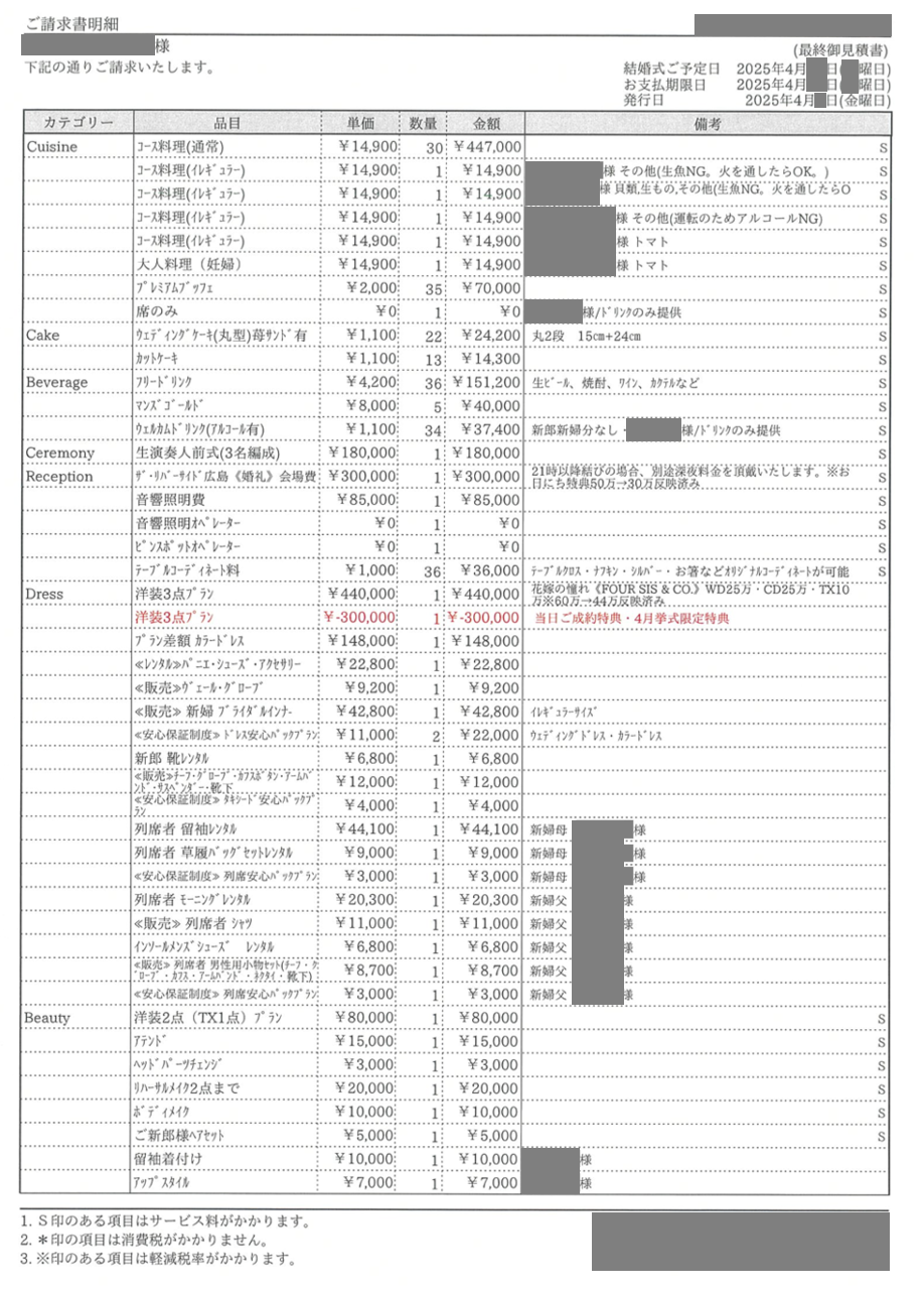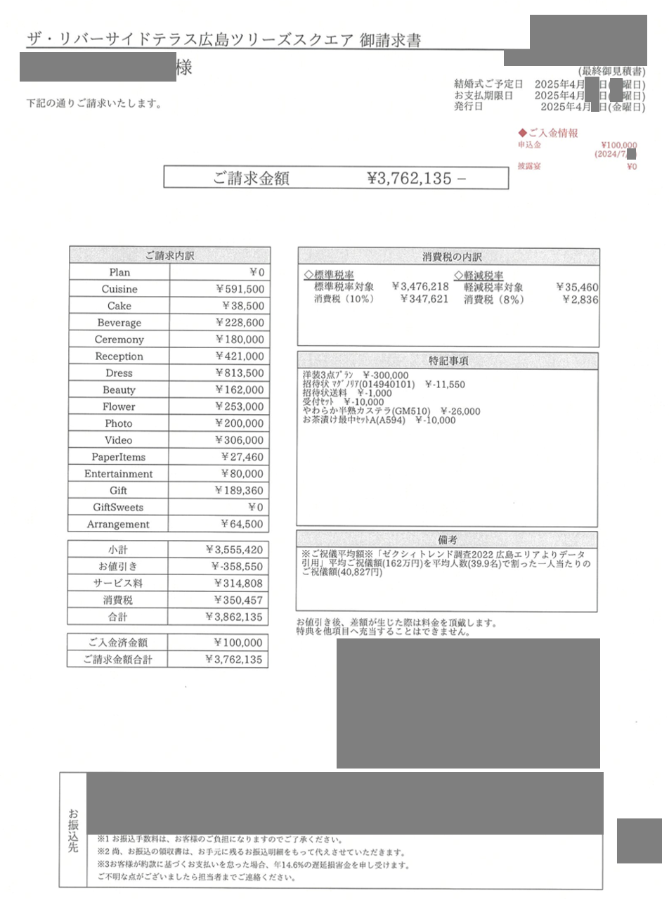 ※投稿された金額情報は、日取り、申込みのタイミングや会場の空き状況等によって異なるため、最終費用明細の項目や金額をもとにした、式場との価格交渉や追加サービス等の要望はご遠慮ください。