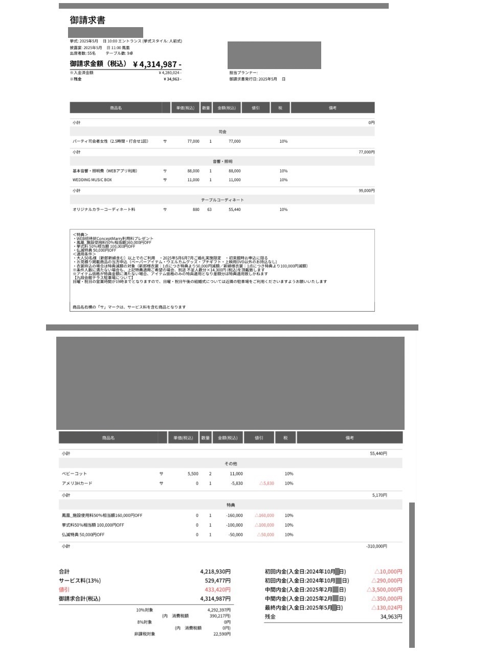 ※料金実例では申込金などを含む会場に支払った"総額"を表示しています。また、料金明細画像の項目名をもとに独自の基準で分類しています。