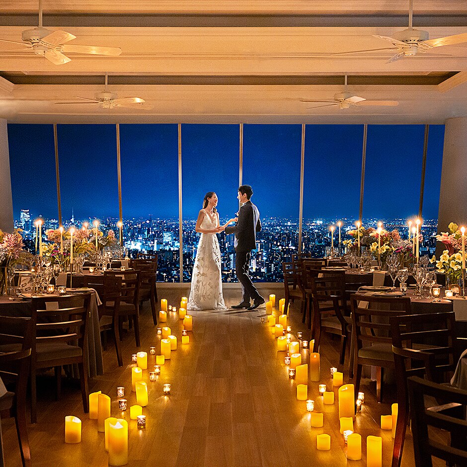 タワー最上階の眺望で笑顔と祝福に包まれたセレモニーシーンを。