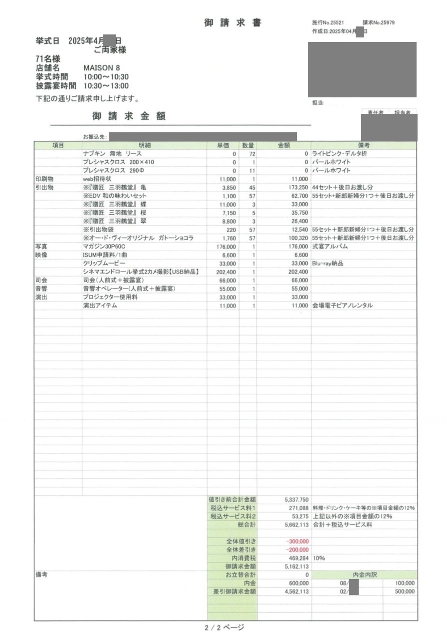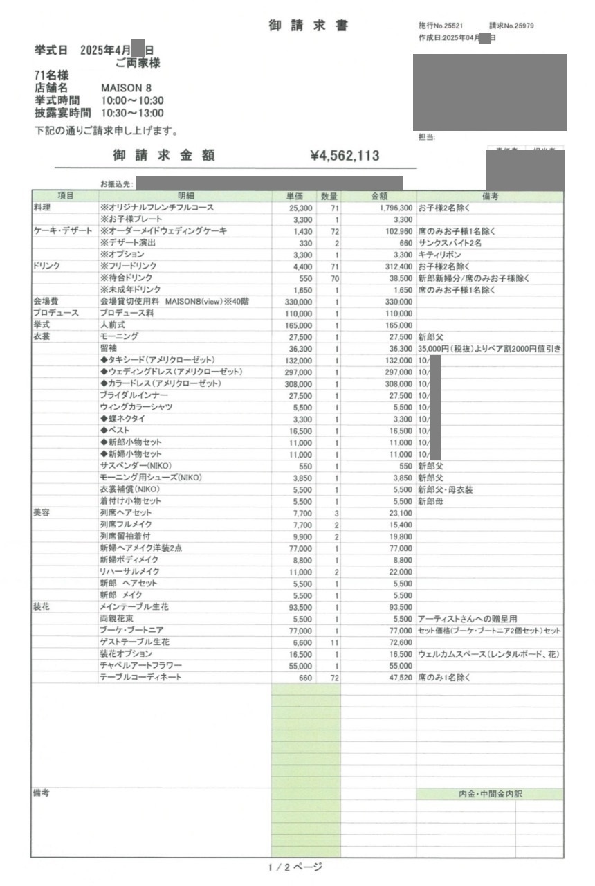 ※投稿された金額情報は、日取り、申込みのタイミングや会場の空き状況等によって異なるため、最終費用明細の項目や金額をもとにした、式場との価格交渉や追加サービス等の要望はご遠慮ください。