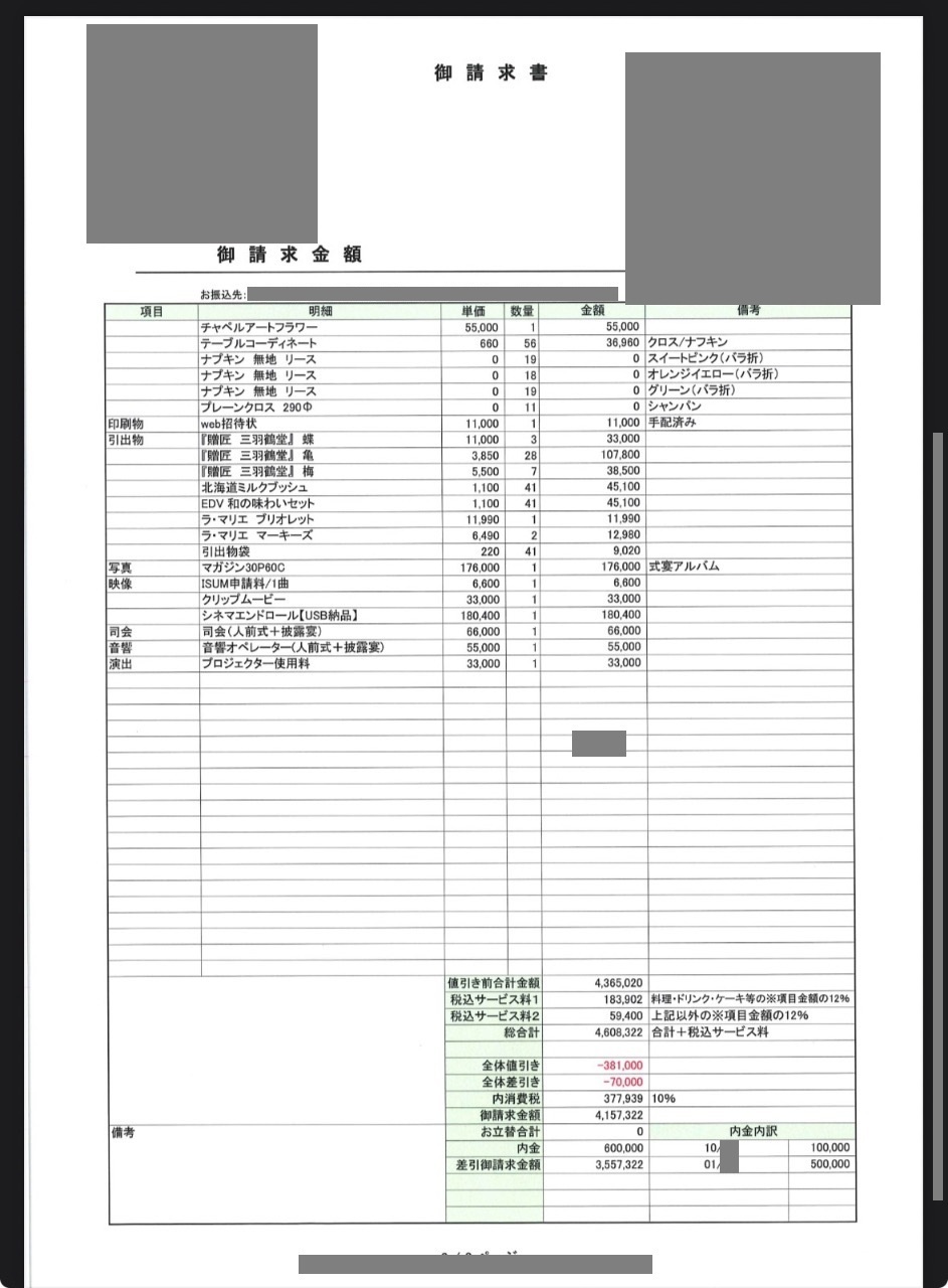 ※投稿された金額情報は、日取り、申込みのタイミングや会場の空き状況等によって異なるため、最終費用明細の項目や金額をもとにした、式場との価格交渉や追加サービス等の要望はご遠慮ください。