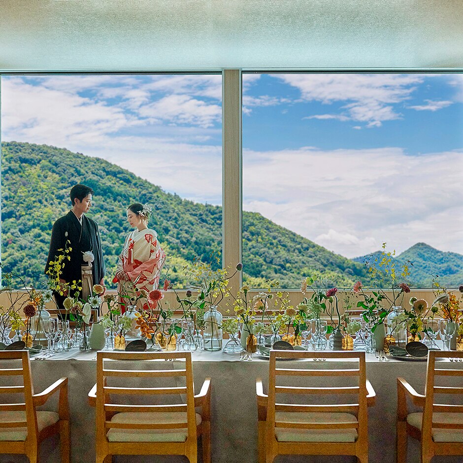 挙式会場からは、長良川と金華山が織りなす壮麗な景色が広がります。 -
