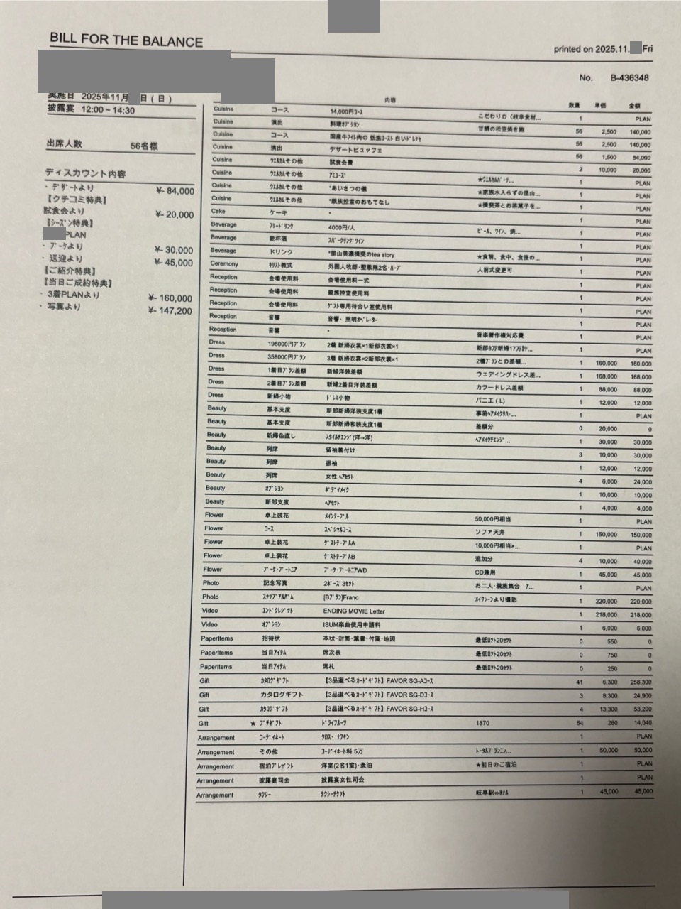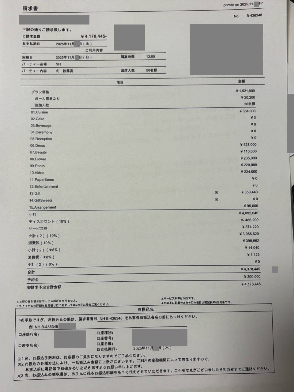 ※投稿された金額情報は、日取り、申込みのタイミングや会場の空き状況等によって異なるため、最終費用明細の項目や金額をもとにした、式場との価格交渉や追加サービス等の要望はご遠慮ください。