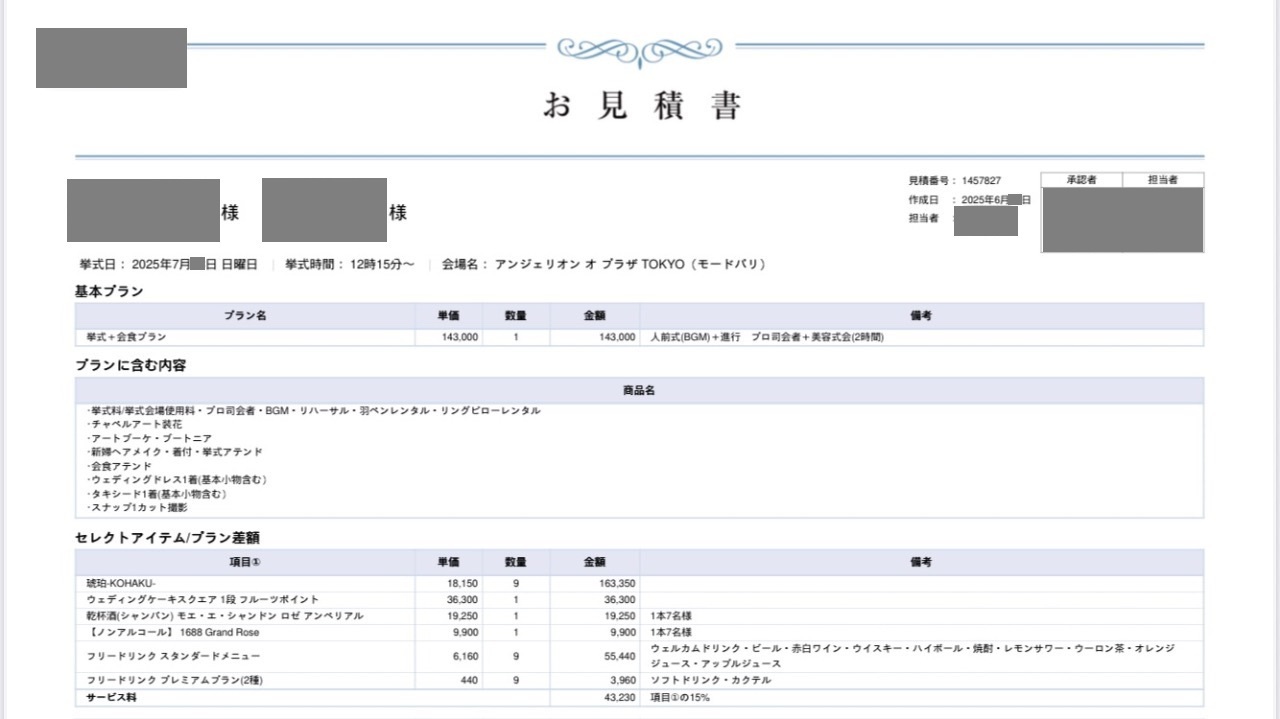 プランナーさんとの打ち合わせでしっかり金額を提示された上で決めていったので、納得のいく金額でした。