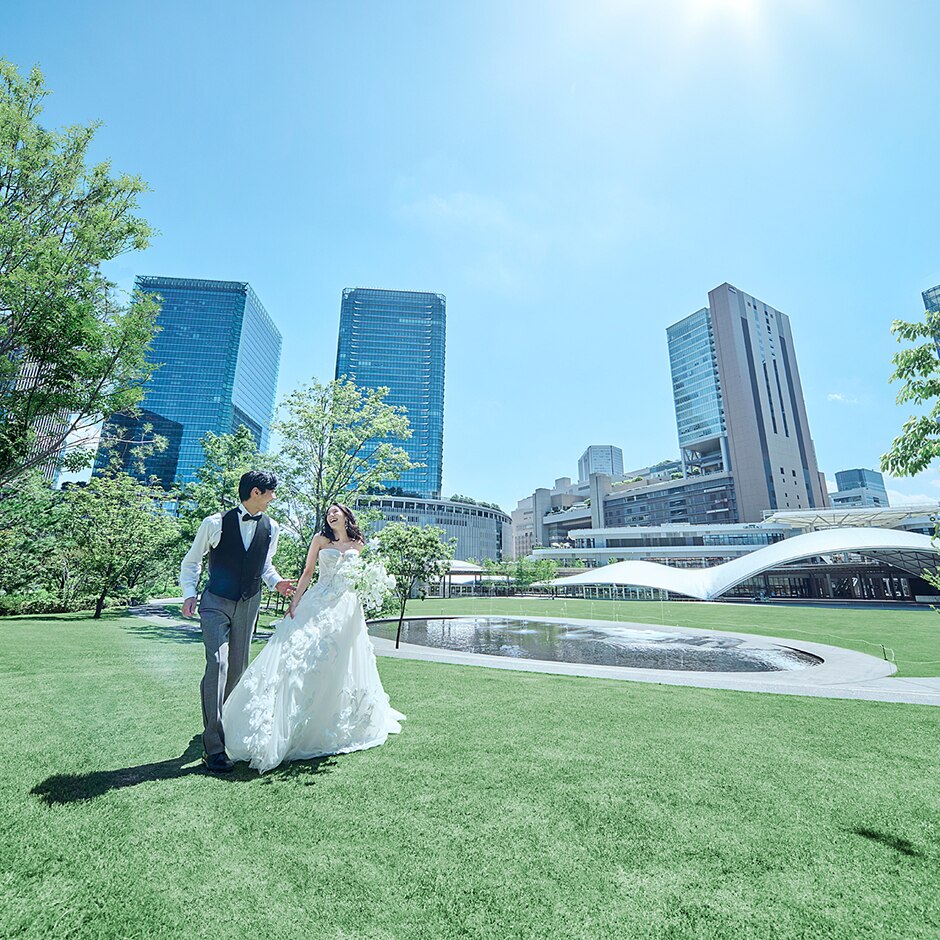 JR大阪駅直結「グラングリーン大阪」内で叶う“一組一棟貸切”の贅沢ウエディング。空と緑が広がる開放的なロケーションの中、屋内外を自由に使いながら、時間も過ごし方も思いのままに。ゲストとふたりが創り上げる特別な一日を。