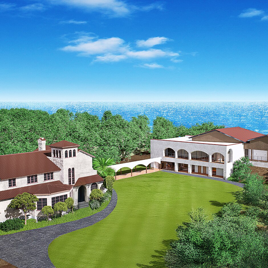 海岸通りに佇む趣深い「旧マッケンジー住宅」を、結婚式場として今に継ぐ「HOMAM 旧マッケンジー邸(国登録有形文化財)」。スパニッシュスタイルの建築美が目を引く空間で、緑・空・海に囲まれながらモダンクラシカルな結婚式を叶えて。※完成予想図