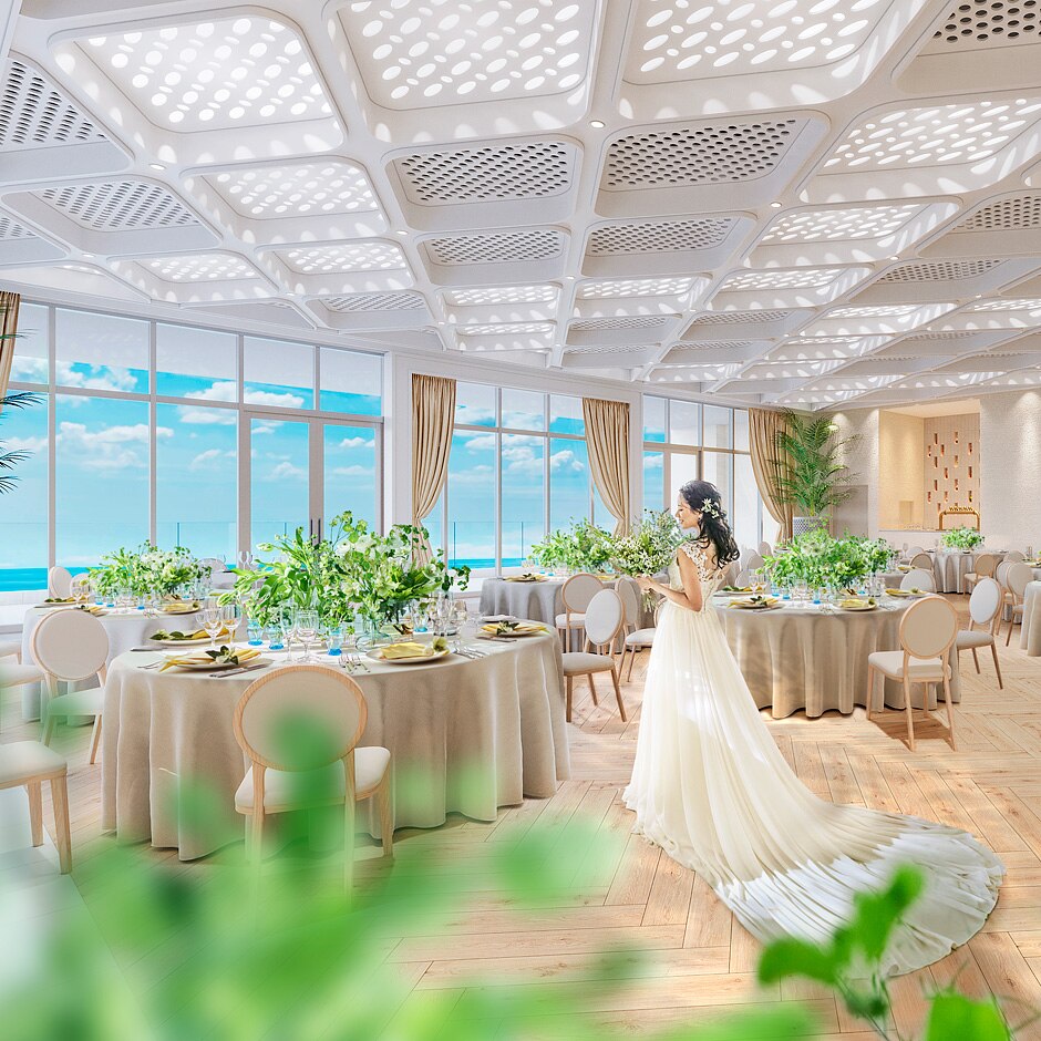 オーシャンビューの挙式、日常と非日常が共存するレストラン、海を見渡す2つのバンケット。洗練された建築美と、心を満たす料理とサービス。ふたりが描く憧れを詰め込んだ、新しい物語が今はじまる。(完成予想図)